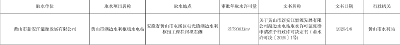 一、同意黄山市新安江能源发展有限公司湖边水电站取水许可证有效期延续至2031年2月14日。
